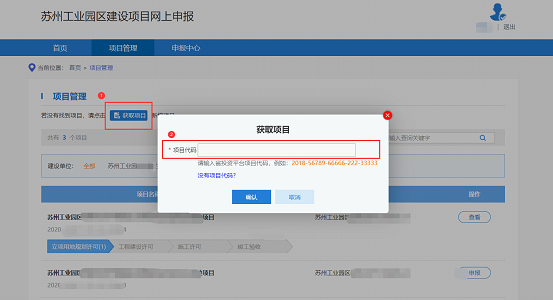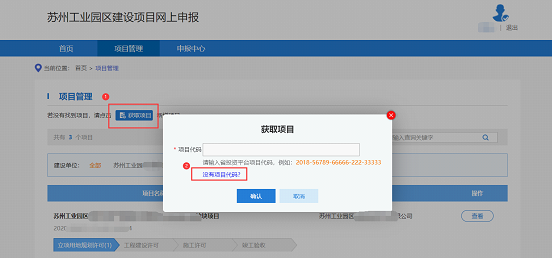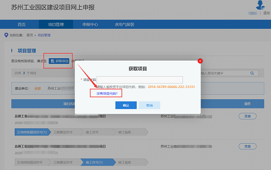 1.2.2.      如果本單位的項目(新拿地、已有地新建等有發改項目代碼的項目)未展示出來,則點擊“獲取項目按鈕”,在項目代碼欄輸入項目代碼獲取項目,點擊“確認”按鈕獲取。