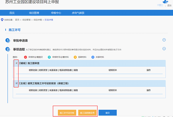 勾選所需辦理的事項前面的復選框,如果所需辦理事項涉及到施工許可證施工圖審查,則下方會出現兩個黃色的“施工許可證申報”“施工圖審查申報”按鈕,點擊按鈕會分別跳轉到對應的平臺辦理對應的業務,其他無需跳轉辦理的辦件,仍在工程建設項目網上申報平臺上傳材料。跳轉提交所需的施工圖審查和施工許可證材料之后,必須在工程建設網上申報平臺點擊藍色的“提交”按鈕,才能提交工改審批端審批,并且點擊“提交”按鈕才會給施工許可和施工圖審查系統發送待辦提醒。
