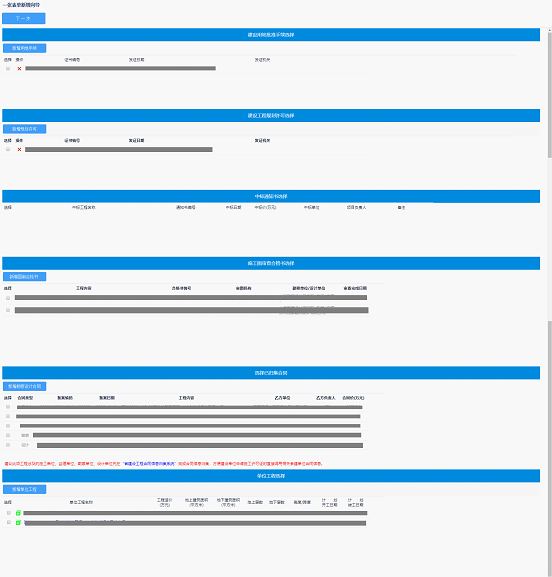 上述內容選擇完成以后點擊“下一步”,系統將根據選擇的內容自動抓取相關數據和文件,生成施工許可申請數據,并進入一張表單數據整理操作界面等待完善和補足。