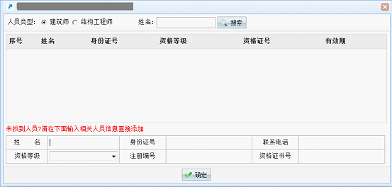 若未找到設計單位人員信息可在圖注5-3窗口添加相關人員信息,施工或監理單位人員需從列表中選不可添加。