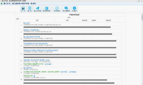 如圖3.8所示,為一張表單數據整理和資料準備窗口,在這里可以完成安全報監、質量報監、施工許可申報表的信息補充和資料的上傳。