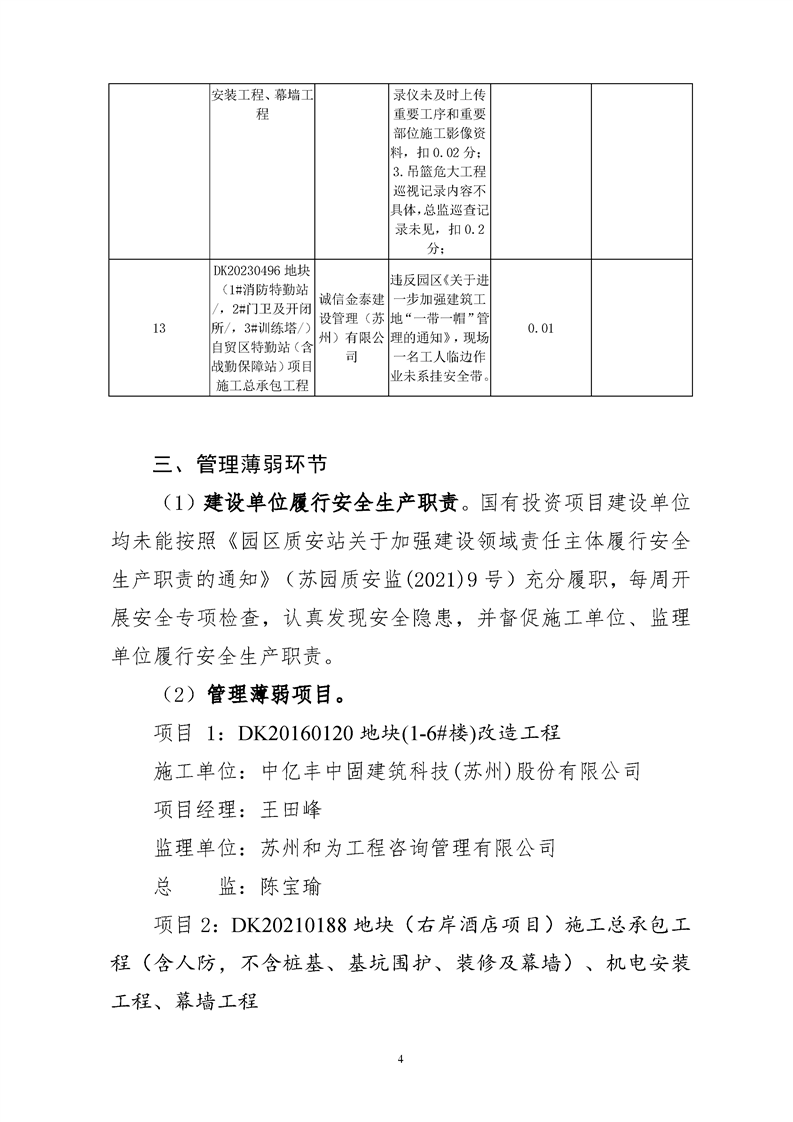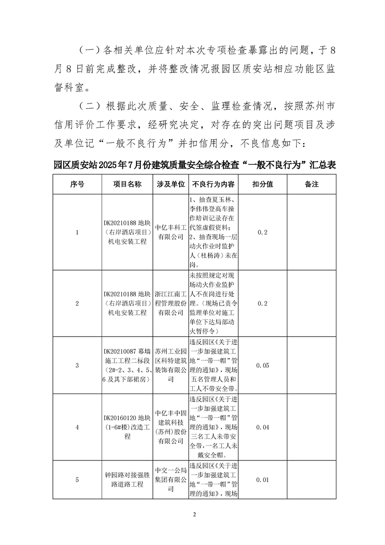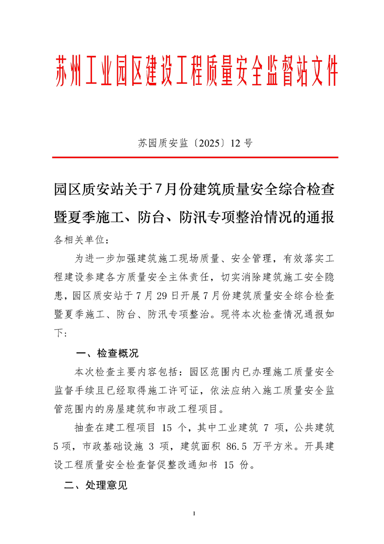 園區質安站關于7月份建筑質量安全綜合檢查暨夏季施工、防臺、防汛專項整治情況的通報