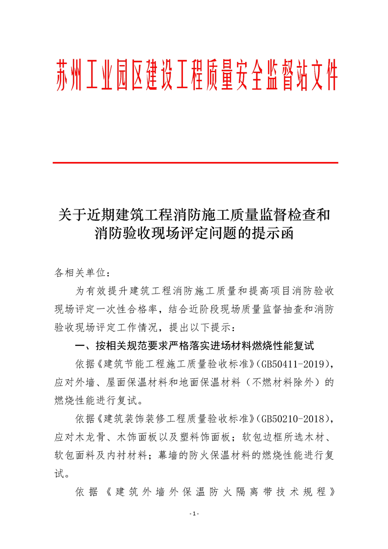 關(guān)于近期建筑工程消防施工質(zhì)量監(jiān)督檢查和消防驗(yàn)收現(xiàn)場(chǎng)評(píng)定問(wèn)題的提示函