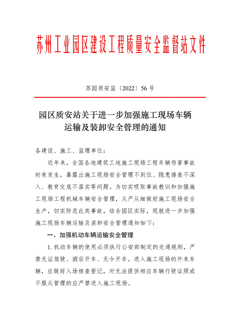 園區(qū)質(zhì)安站關(guān)于進(jìn)一步加強(qiáng)施工現(xiàn)場車輛運(yùn)輸及裝卸安全管理的通知