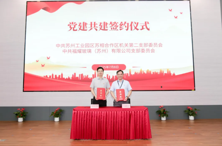 現場,中共蘇州工業園區蘇相合作區機關第二支部委員會與中共福耀玻璃(蘇州)有限公司支部委員會簽署黨建共建協議,雙方將以“結對共建”為契機,共同探索創新黨建與業務融合的新模式、新機制,以常態化的聯建平臺,實現資源共享,推動福耀蘇州綜合發展實力再上新臺階。