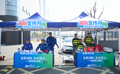 活動現場設置了消防裝備展示、滅火器、消火栓實操和急救技能培訓區,在消防救援隊、蘇州青年藍天救援隊的專業指導下,企業代表們系統學習不同類型的火災應采用何種滅火方法,并分批進行實操練習,同時,園區“應急第一響應人”招募也同步開展。通過“手把手”教學,參訓人員熟練掌握了消防器材使用方法、初期火災撲救技巧及現場急救技能,真正體現了消防宣傳月“全民消防”的主題要求。