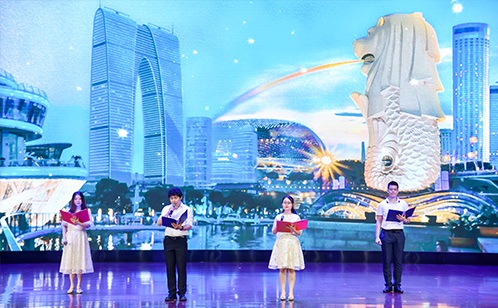 第二篇章“華麗蛻變 共謀發展新篇”,回顧園區發展波瀾壯闊三十年,以原創詩、雙語詩等形式展現園區日新月異的成就;其中《靜穆的躍升》一詩由新加坡作者原創,由中國科學技術大學蘇州高等研究院和新加坡國立大學蘇州研究院兩校師生共同演繹,在語言的交織中傳遞著中新合作的力量。