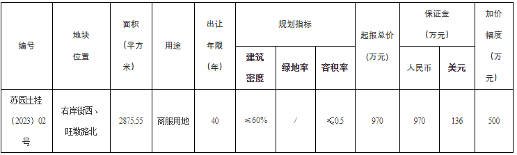 6、成交通知:地塊成交后,網(wǎng)上出讓系統(tǒng)自動(dòng)生成《網(wǎng)上掛牌出讓成交通知書》。競(jìng)得人應(yīng)按成交通知書要求,于該地塊網(wǎng)上出讓系統(tǒng)確認(rèn)競(jìng)得之日起5個(gè)工作日內(nèi)(最晚于2023年9月4日16:00前),持成交通知書及有效證件原件、復(fù)印件等提交蘇州工業(yè)園區(qū)土地儲(chǔ)備中心進(jìn)行競(jìng)買資格審查。