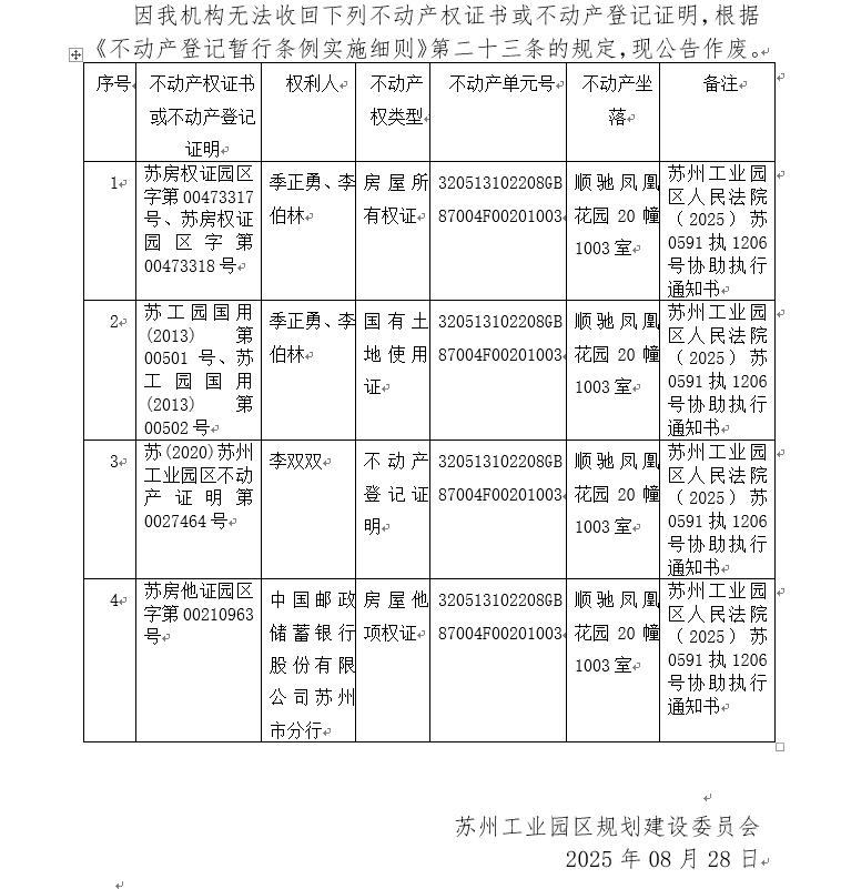 不動(dòng)產(chǎn)權(quán)證書/登記證明作廢公告蘇園 證廢字2025(0128)號(hào)(順馳鳳凰花園20幢1003室)