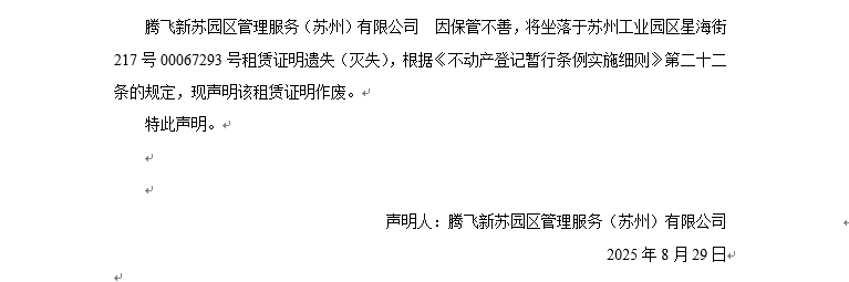 關于蘇州工業園區星海街217號00067293號租賃證明遺失(滅失)聲明