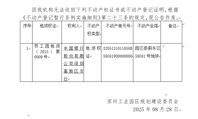 不動產權證書/登記證明作廢公告蘇園 證廢字2025(0136)號(園區(qū)婁葑東區(qū)59581號地塊)
