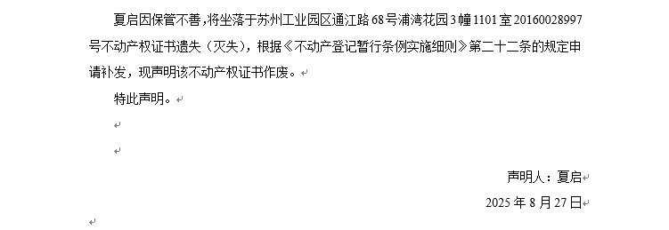 關于蘇州工業園區通江路68號浦灣花園3幢1101室20160028997號不動產權證書遺失聲明