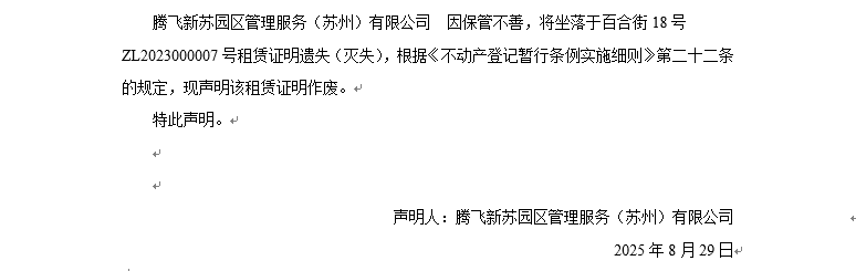 關于百合街18號ZL2023000007號租賃證明遺失(滅失)聲明