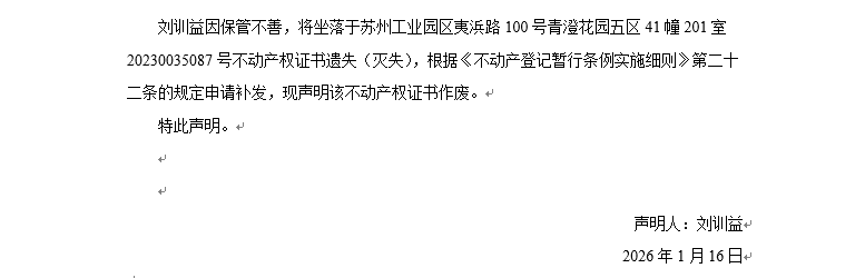 關(guān)于蘇州工業(yè)園區(qū)夷浜路100號青澄花園五區(qū)41幢201室20230035087號不動產(chǎn)權(quán)證書遺失聲明