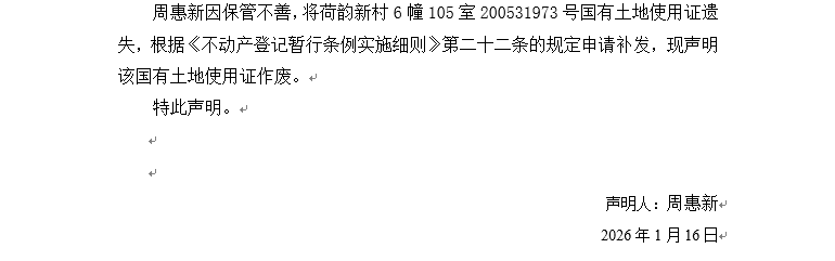 關于荷韻新村6幢105室200531973號國有土地使用證遺失聲明