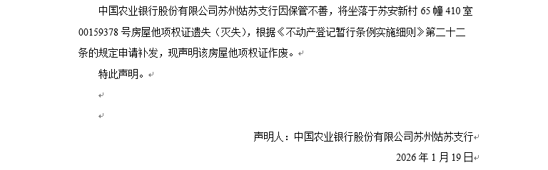 關于蘇安新村65幢410室00159378號房屋他項權證遺失聲明