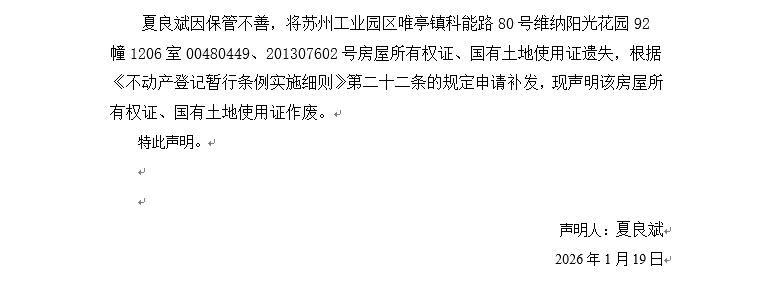 關(guān)于蘇州工業(yè)園區(qū)唯亭鎮(zhèn)科能路80號維納陽光花園92幢1206室00480449、201307602號房屋所有權(quán)證、國有土地使用證遺失聲明