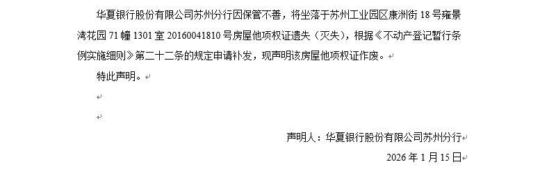 關于蘇州工業園區康洲街18號雍景灣花園71幢1301室20160041810號房屋他項權證遺失聲明