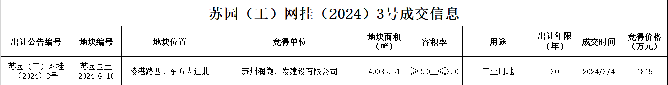 蘇園(工)網(wǎng)掛(2024)3號(hào)成交信息