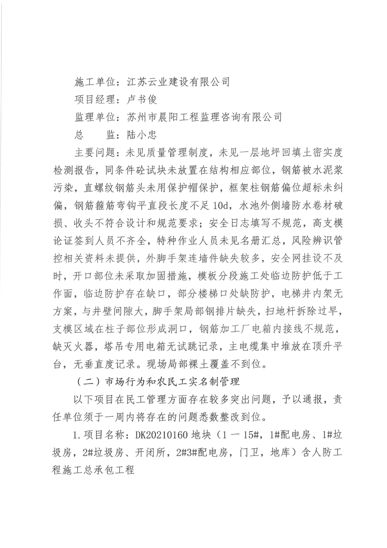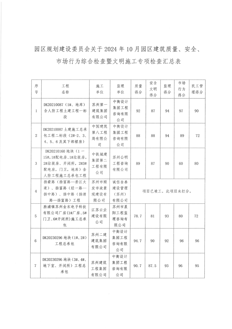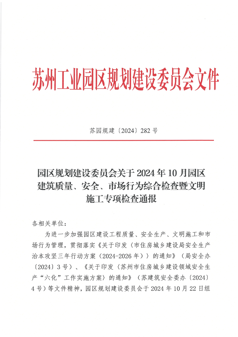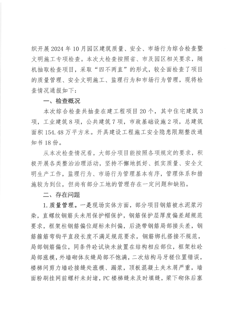 園區規劃建設委員會關于2024年10月園區建筑質量、安全、市場行為綜合檢查暨文明施工專項檢查通報