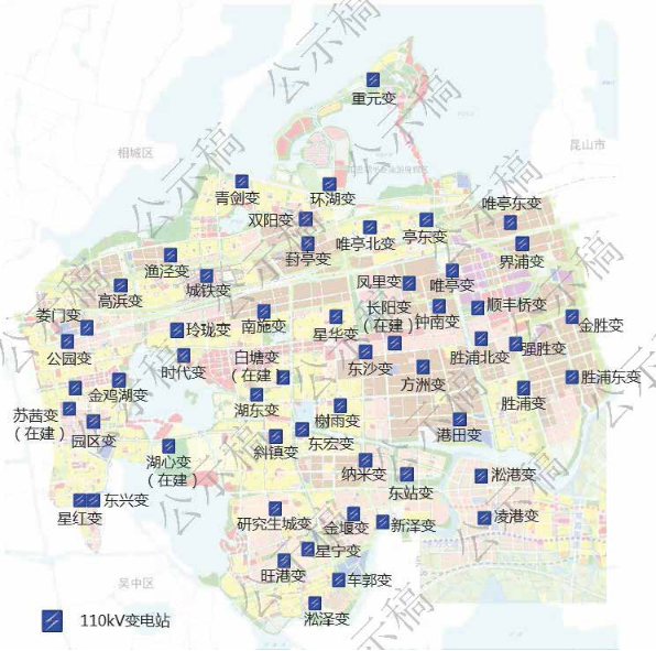 遠期園區(qū)共設置110千伏變電站52座。保留現(xiàn)狀110千伏變電站14座;擴建現(xiàn)狀110千伏變電站16座;在建110千伏變電站4座(蘇茜變、白塘變、湖心變和長陽變);規(guī)劃新建110千伏變電站22座。