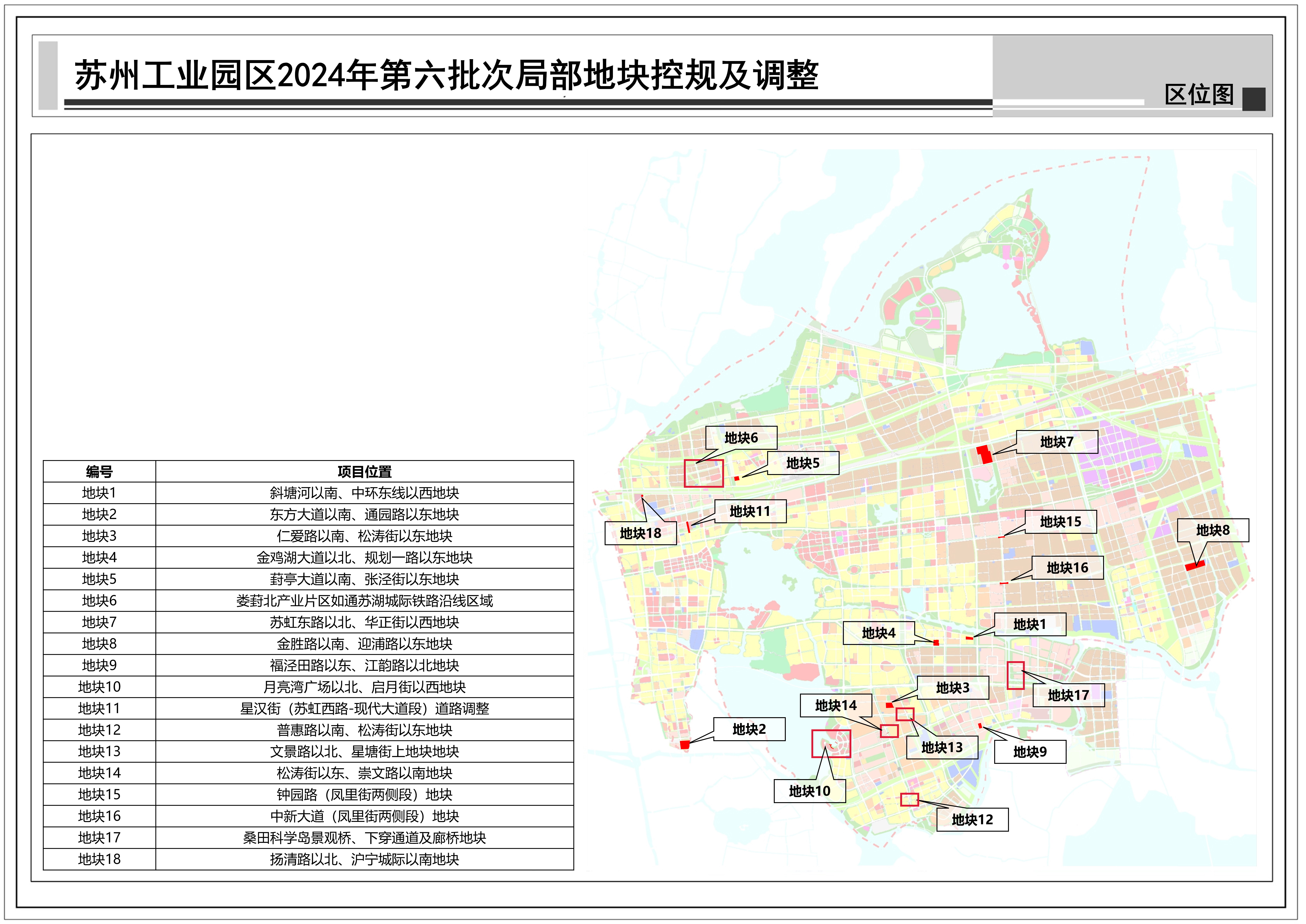 蘇州工業園區2024年第六批次局部地塊控規及調整:共包括18個地塊,總用地面積約0.80平方公里,詳見附圖區位圖。