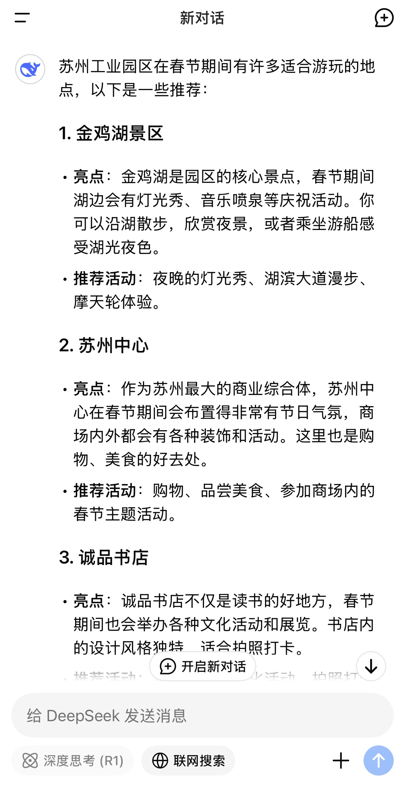DeepSeek可真是太懂園區(qū)啦!作為時尚潮流的現(xiàn)代化城市,園區(qū)端出“游住購行”一站式新春盛宴,各大商圈聯(lián)動景點,打響“新春鬧市集”品牌,營造充滿年味與文化韻味的歡聚體驗,讓市民游客感受非一般的“酥”年。下面跟著DeepSeek一起玩轉(zhuǎn)“年味版”園區(qū)吧!