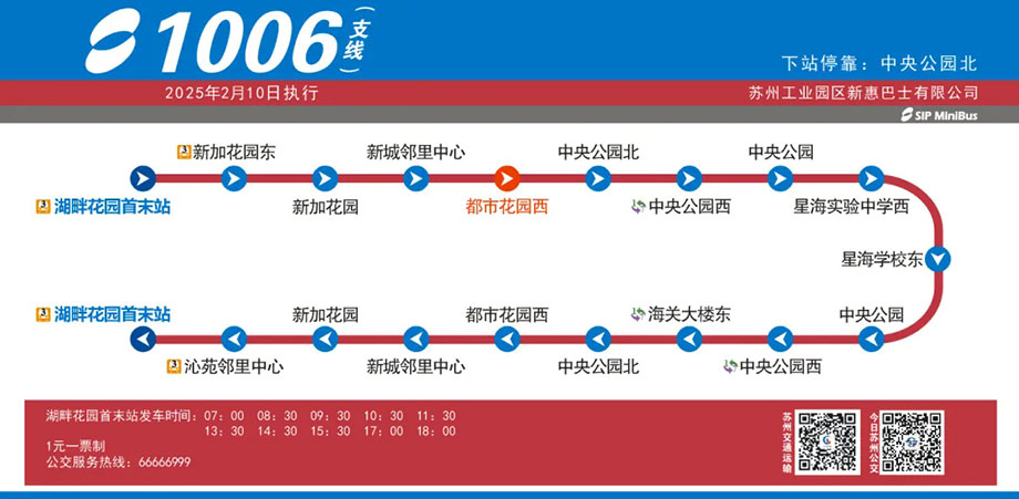 1006路支線則主要方便湖西新加花園、新城花園、都市花園、沁苑小區、湖畔花園等小區居民前往中央公園、星海學校的出行,營運時間以湖畔花園首末站為準,分別為7:00、8:30、9:30、10:30、11:30、13:30、14:30、15:30、17:00、18:00。