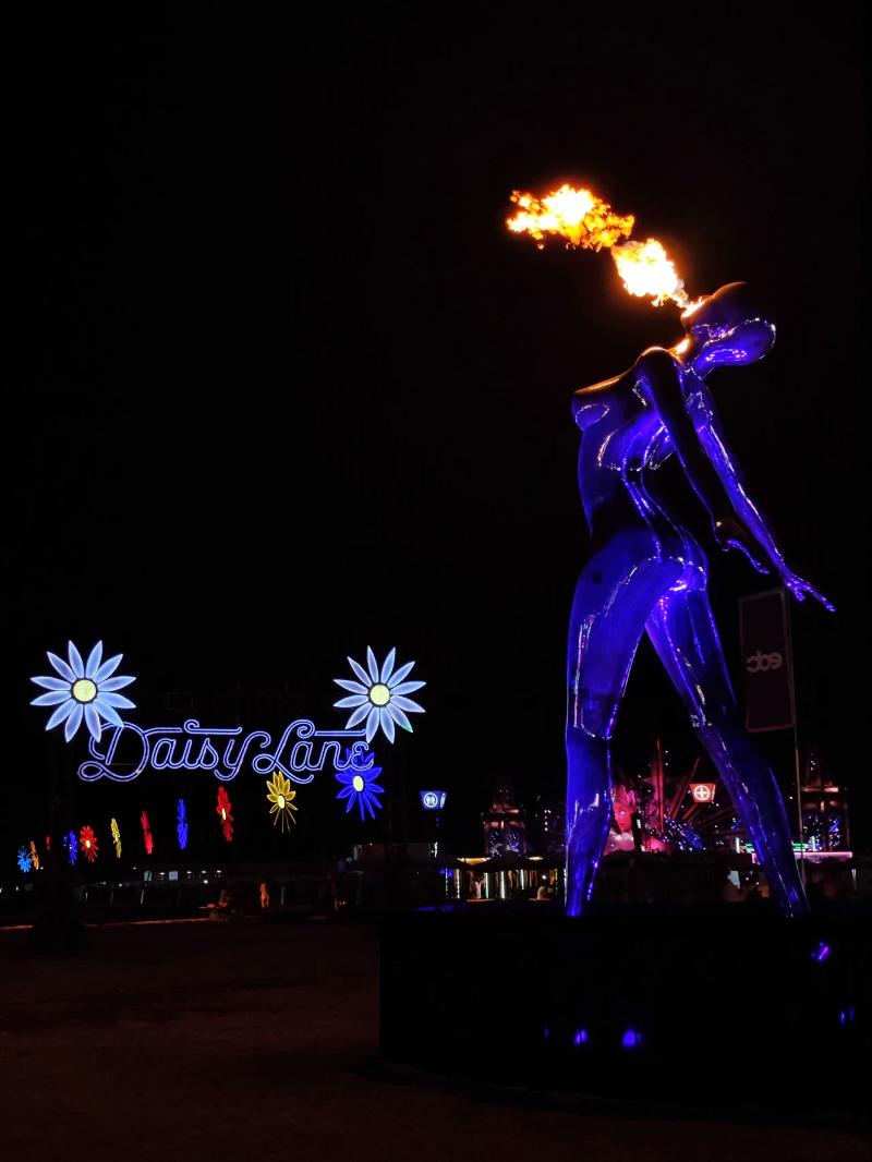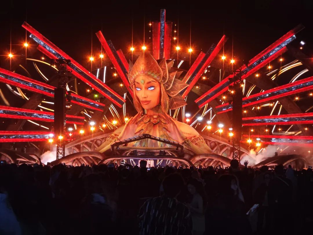 全球頂尖團隊設計的日升女神kineticFIELD主舞臺,通過精密機械實現女神雙臂隨樂律動,配合激光、火焰與同步煙花,首日便誕生百萬級傳播的“女神”名場面。circuitGROUNDS舞臺以360度巨型LED墻構建科技矩陣,stereoBLOOM舞臺以前衛工業風見證多位國際大咖中國首秀,boomboxARTCAR移動舞臺則以“巨型音箱”造型引爆隨行狂歡。