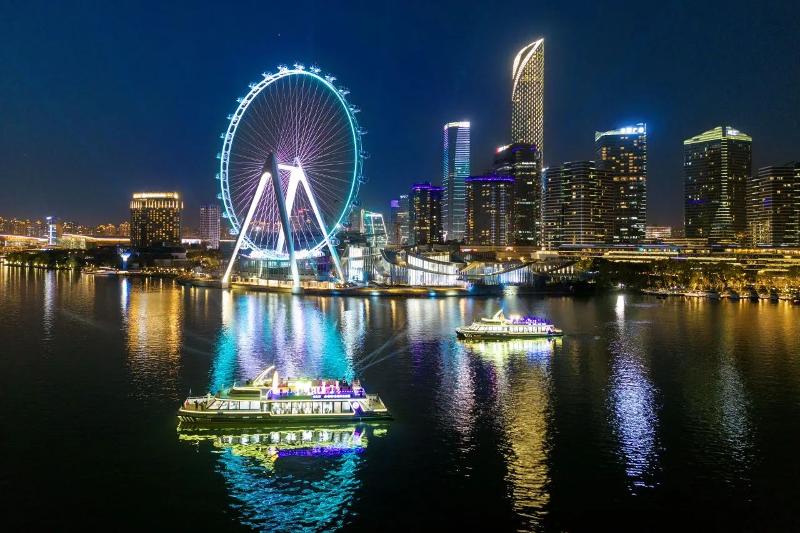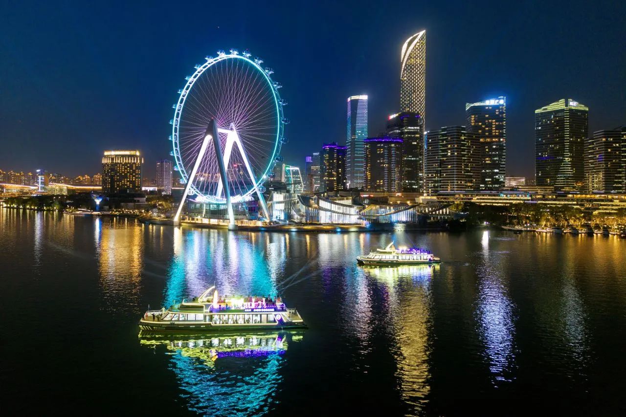 如果說(shuō)“蘇州之眼”是天空的詩(shī)篇,那么右岸新航線就是水面的畫卷。夜幕降臨,“蘇州之眼”摩天輪星光閃耀,金雞湖雙體新游船霓虹流轉(zhuǎn),水岸光影交相輝映,為園區(qū)這座現(xiàn)代化新城更添了幾分夢(mèng)幻與浪漫色彩,令人流連忘返。
