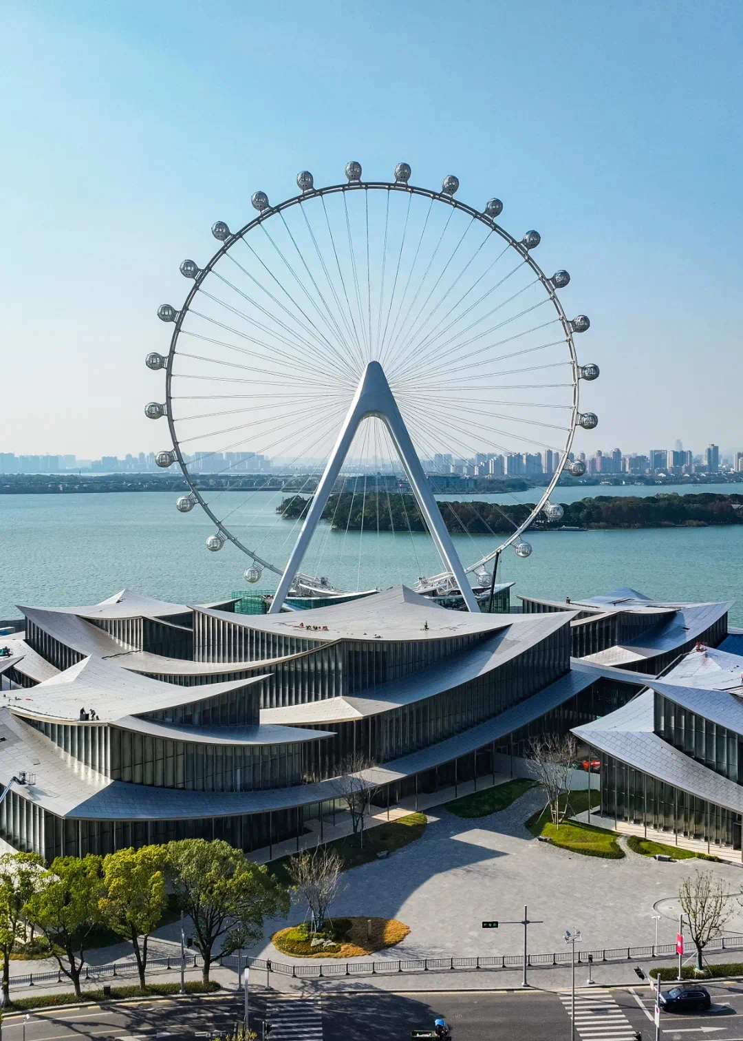 據(jù)介紹,“蘇州之眼”的設(shè)計(jì)靈感源于江南水鄉(xiāng)的柔美與蘇州園林的意境。通過(guò)異型雙立柱輪輻式結(jié)構(gòu)及回轉(zhuǎn)式太空艙,既保留了傳統(tǒng)水鄉(xiāng)的婉約氣質(zhì),又以科技感造型融入現(xiàn)代CBD天際線。摩天輪底部建筑運(yùn)用“折紙藝術(shù)”,采用折扇形屋頂及大面積落地玻璃設(shè)計(jì),打造“濱水而居”的獨(dú)特空間體驗(yàn)。