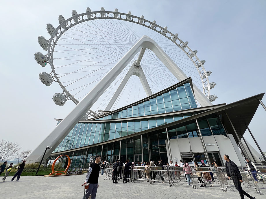 不遠(yuǎn)處,“蘇州之眼”摩天輪也在春光里“玩轉(zhuǎn)”城市的極致浪漫。作為亞洲最大的水上摩天輪,“蘇州之眼”高128米,共設(shè)有28個全景轎廂,每個轎廂可容納25人,旋轉(zhuǎn)一圈約30分鐘,可360°俯瞰金雞湖及園區(qū)乃至蘇州全景。