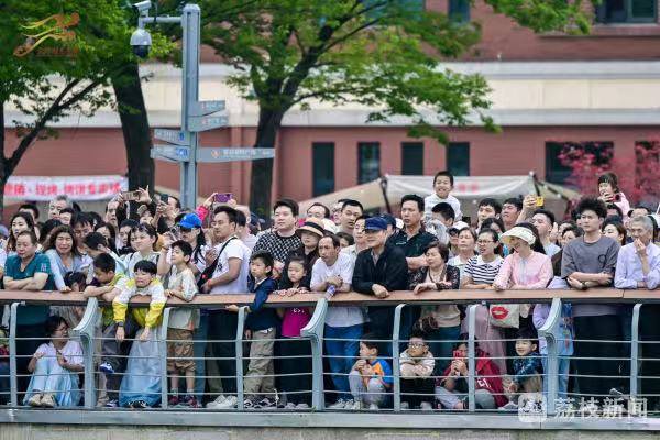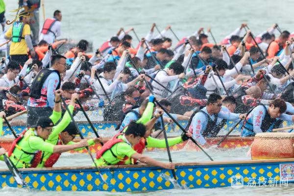 金雞湖上,一艘艘龍舟上演百龍爭渡,龍舟隊員們齊心協(xié)力、揮槳如飛,向著終點全力沖刺。現(xiàn)場,既有專業(yè)隊伍的速度與激情,也有國際友人解鎖“龍舟新姿勢”,彰顯著“龍舟精神”的多元魅力。如今,金雞湖端午龍舟賽已經(jīng)成為蘇州的新民俗,吸引了眾多的市民和游客前來觀賽,為自己喜愛的隊伍加油助威。