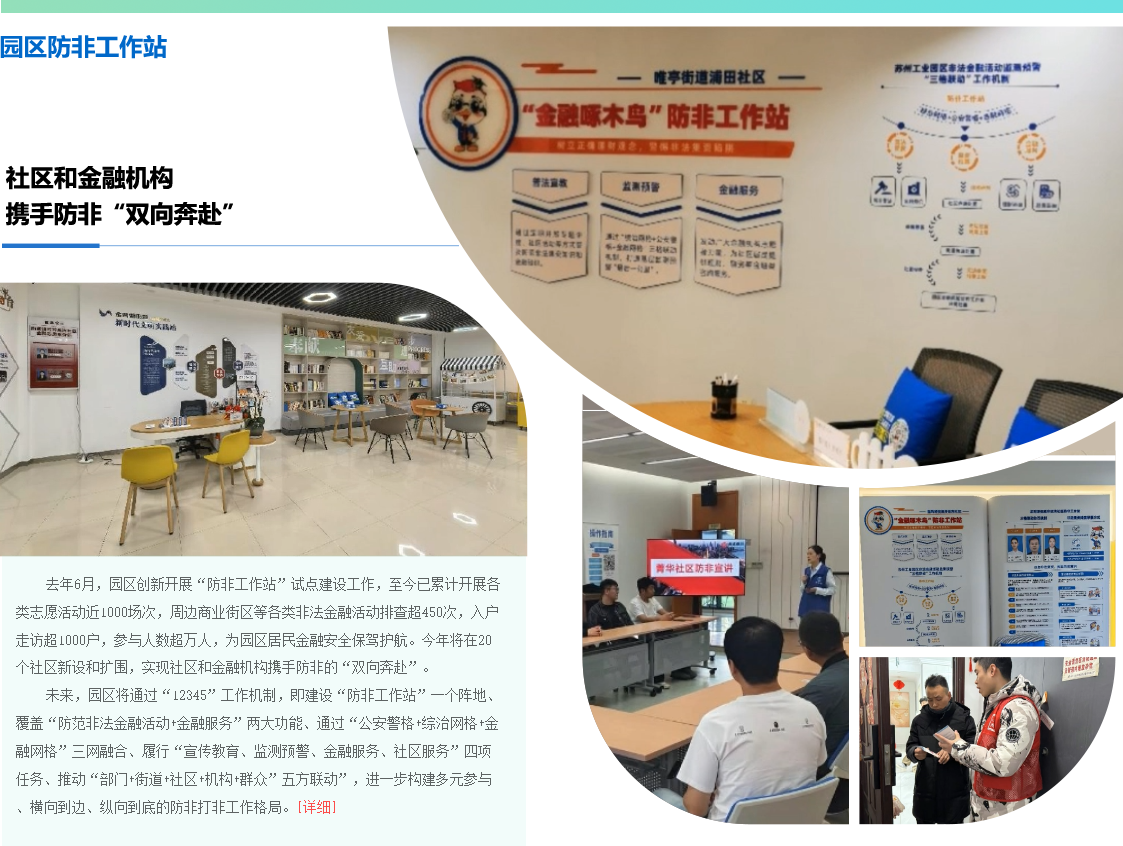 為識別非法集資的重重偽裝,蘇州工業園區斜塘街道堅持“線上監測、線下排查、舉報獎勵、宣傳教育”四位一體的防范體系,通過構建多維宣傳矩陣、深化政銀共治機制、織密聯動防控網的綜合策略,有... [詳細]