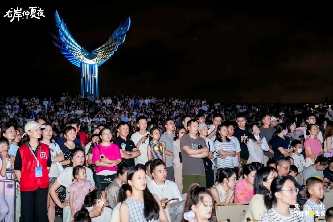 一場夏雨洗盡了白日的悶熱,湖畔涼風(fēng)習(xí)習(xí),正是享受音樂的絕佳時(shí)刻,右岸客廳下沉廣場的臺階上,早已坐滿了慕名而來的觀眾,飛翔雕塑旁、湖畔步道上處處是翹首以盼的身影。