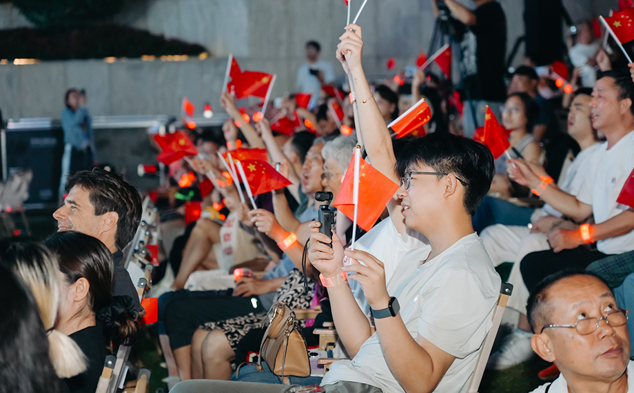 舞臺(tái)下,閃爍的熒光手環(huán)和舞動(dòng)的小紅旗則是觀眾們的熱烈應(yīng)答。市民張女士與孩子一起席地而坐,一起欣賞著樂(lè)團(tuán)的演奏,一邊在報(bào)幕的間隙為孩子解釋影片和樂(lè)曲的背景。她說(shuō):“有些電影我小時(shí)候看過(guò),配樂(lè)非常經(jīng)典,在蘇交的演繹下更顯氣勢(shì)磅礴。在今天這個(gè)日子里,這一場(chǎng)音樂(lè)會(huì)既是藝術(shù)的盛宴,更是一次家國(guó)情懷的滋養(yǎng)。”