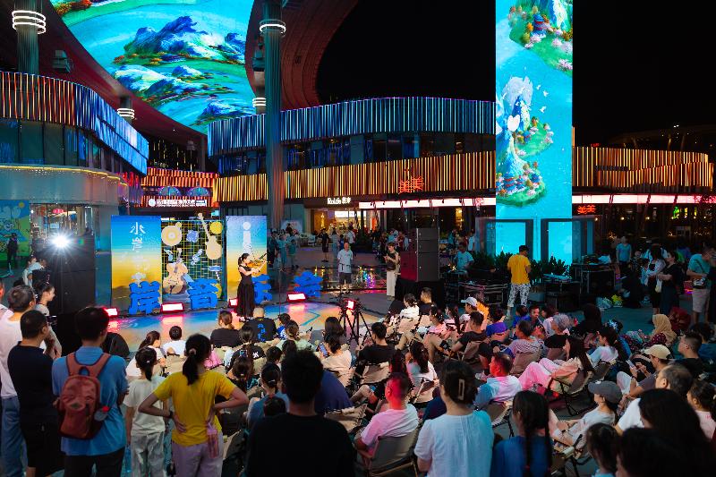 在圓融時(shí)代廣場天幕街東街沿岸,為期八天的“水岸音樂會”為假日增添了輕松閑適的底色。夜幕降臨,華燈初上,民謠歌手的淺吟低唱與流行樂隊(duì)的歡快節(jié)奏,伴著微涼的晚風(fēng)飄散開來。觀眾們或手捧咖啡,或拿著冰淇淋,隨意地席地而坐,孩子們則隨著音樂節(jié)奏輕輕搖擺。