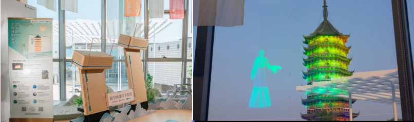 在蘇州絲綢博物館“未來館”二樓,基于虛實(shí)融合透明空間顯示打造的懸空成像打卡裝置已實(shí)現(xiàn)落地應(yīng)用,體驗(yàn)者無需佩戴VR、AR等設(shè)備即可感受裸眼3D動(dòng)態(tài)場(chǎng)景呈現(xiàn)。裝置巧妙融合北寺塔實(shí)景與數(shù)字影像:窗外的千年古塔與屏中的三維動(dòng)態(tài)模型交相輝映,為觀眾營造出時(shí)空交疊的沉浸式體驗(yàn)。