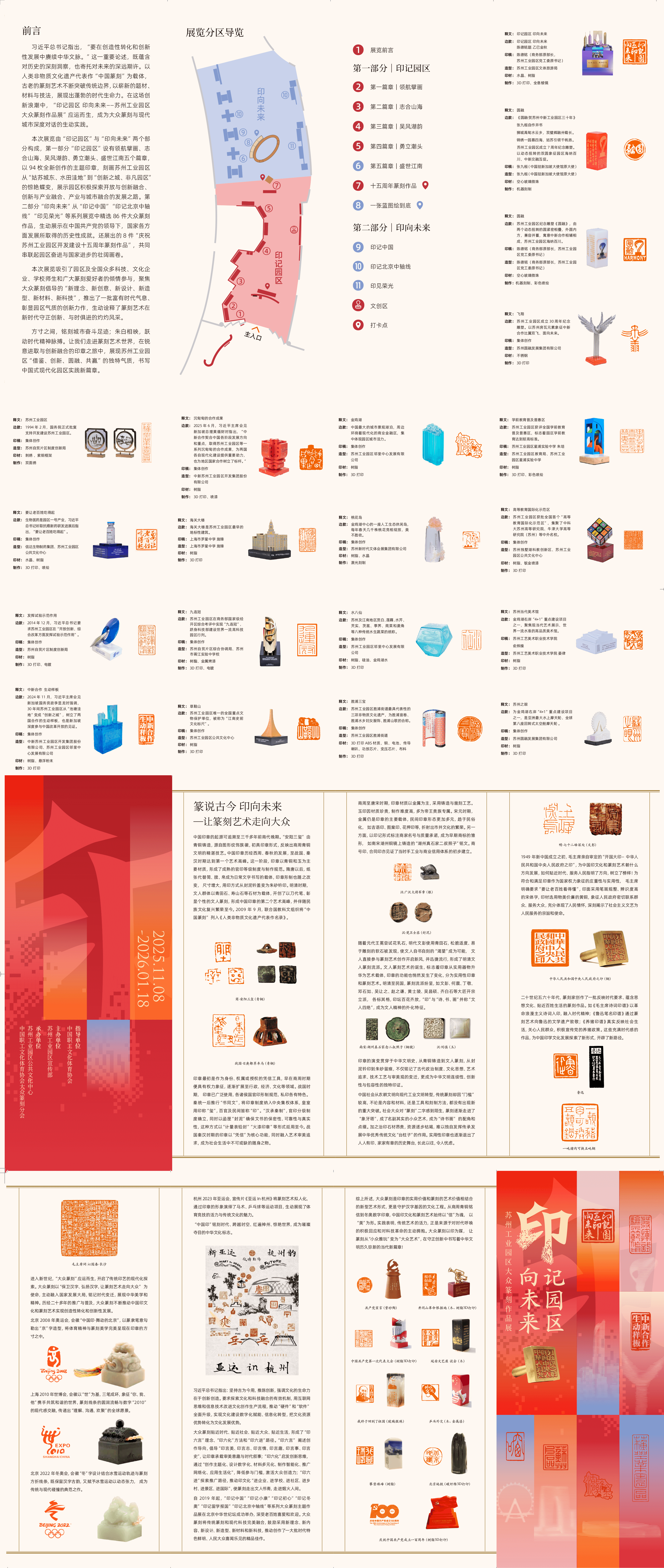 當(dāng)傳統(tǒng)篆刻技藝與現(xiàn)代科技相遇,當(dāng)印石藝術(shù)記錄城市發(fā)展年輪,一場(chǎng)跨越時(shí)空的藝術(shù)對(duì)話正在上演。2025年11月8日至2026年1月18日,“印記園區(qū) 印向未來(lái)”蘇州工業(yè)園區(qū)大眾篆刻作品展正式在園區(qū)文化館拉開帷幕,展覽精選180枚篆刻佳作,以方寸之間的藝術(shù)語(yǔ)言,生動(dòng)展現(xiàn)園區(qū)發(fā)展歷程、創(chuàng)新精神與文化底蘊(yùn),為“金秋·三湖嘉年華”增添獨(dú)特的藝術(shù)魅力。展品精良,深植園區(qū)文化基因展覽以“印記園區(qū)”“印向未來(lái)”兩大板塊構(gòu)建完整敘事脈絡(luò),不僅彰顯了專業(yè)的藝術(shù)水準(zhǔn),更深度融合園區(qū)特質(zhì),讓篆刻藝術(shù)與園區(qū)發(fā)展、城市記憶深度交融。在“印記園區(qū)”部分,94枚全新創(chuàng)作的印章形成“領(lǐng)航擘畫”“志合山海”“吳風(fēng)湖韻”“勇立潮頭”“盛世江南”五大篇章,立體勾勒了園區(qū)的驚艷蝶變。其中,《發(fā)揮試驗(yàn)示范作用》印章以DNA雙螺旋結(jié)構(gòu)象征生物醫(yī)藥、芯片造型... [詳細(xì)]