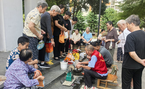 與此同時(shí),同星園廣場(chǎng)上熱鬧非凡,一場(chǎng)結(jié)合便民服務(wù)與趣味游園的創(chuàng)意活動(dòng)在此開(kāi)展。便民服務(wù)區(qū)內(nèi)匯聚了健康咨詢、理發(fā)修甲、磨刀、智能AI宣傳、套圈等多元化項(xiàng)目,網(wǎng)格員和志愿者引導(dǎo)居民有序參與,并耐心為老人測(cè)量血壓,提供個(gè)性化健康指導(dǎo)。游園活動(dòng)區(qū)內(nèi)人頭攢動(dòng),投壺競(jìng)技、果蔬套圈、“好運(yùn)滾滾來(lái)”等游戲項(xiàng)目前吸引了不少老年居民圍觀參與。“紅管”志愿者用通俗易懂的語(yǔ)言講解游戲規(guī)則,協(xié)助老人游玩,現(xiàn)場(chǎng)笑聲不斷,讓老年居民在輕松愉悅的氛圍中感受社區(qū)的貼心關(guān)懷。