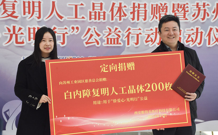 崇德向善,與愛同行。12月24日上午,蘇州“僑愛心·光明行”公益行動(dòng)啟動(dòng)儀式在蘇州工業(yè)園區(qū)舉行。現(xiàn)場(chǎng),愛心企業(yè)西安眼得樂醫(yī)療科技公司向蘇州工業(yè)園區(qū)慈善總會(huì)定向捐贈(zèng)白內(nèi)障復(fù)明人工晶體200枚,后續(xù)將由蘇州九龍醫(yī)院推進(jìn)落實(shí),惠及在蘇僑胞及全市眼部疾病患者。