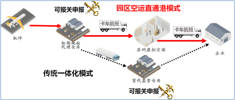 2002年,園區依托中新合作優勢,借力上海機場的“跑道”延伸,在全國首設“虛擬空港”,創新推出“SZV”雙向直航空陸聯程模式,打造具備目的地和始發港雙重身份的“國際貨運機場”,讓蘇州企業在園區實現屬地申報、屬地查驗和放行,使貨物通關時間由原先的至少48小時減至16小時左右,壓縮了近三分之二。