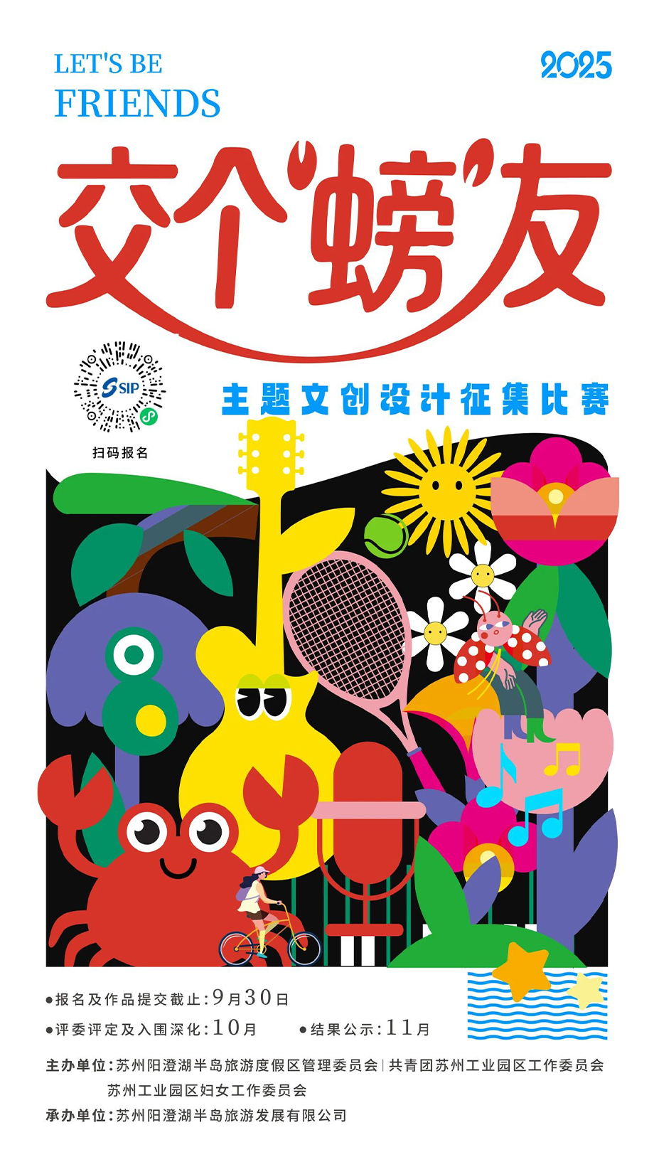 本次活動(dòng)巧妙依托蘇州知名風(fēng)物——“陽(yáng)澄湖大螃蟹”這一廣受歡迎的“網(wǎng)紅IP”,借用“大螃蟹”(螃)與“朋友”(朋)的諧音,圍繞陽(yáng)澄湖半島國(guó)家級(jí)旅游度假區(qū)“青年友好、兒童友好、運(yùn)動(dòng)友好、音樂友好、寵物友好”五大元素,開展貼近年輕群體的文創(chuàng)潮流設(shè)計(jì)。