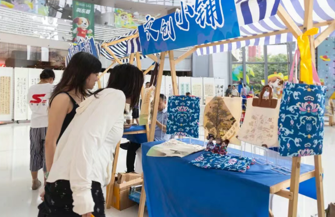 在文化薪傳區(qū),以傳統(tǒng)與現(xiàn)代交融的美學(xué)設(shè)計(jì)將紅色記憶與非遺相融。用十八紙蜂窩紙凳組合成的展示臺(tái)上,巧妙陳列著水鄉(xiāng)服飾等非遺實(shí)物,訴說著當(dāng)年婦女織布做衣的往事;“非遺燈箱”裝置完美融合了非遺元素與現(xiàn)代光影藝術(shù),流轉(zhuǎn)間引導(dǎo)居民感悟美好生活的珍貴;“勝浦造物坊”展示的繡花紋案U型枕、雨傘、扇子,以及融入了水鄉(xiāng)服飾元素的冰箱貼、相框等文創(chuàng)產(chǎn)品,更讓非遺“活”在當(dāng)下,走進(jìn)日常。