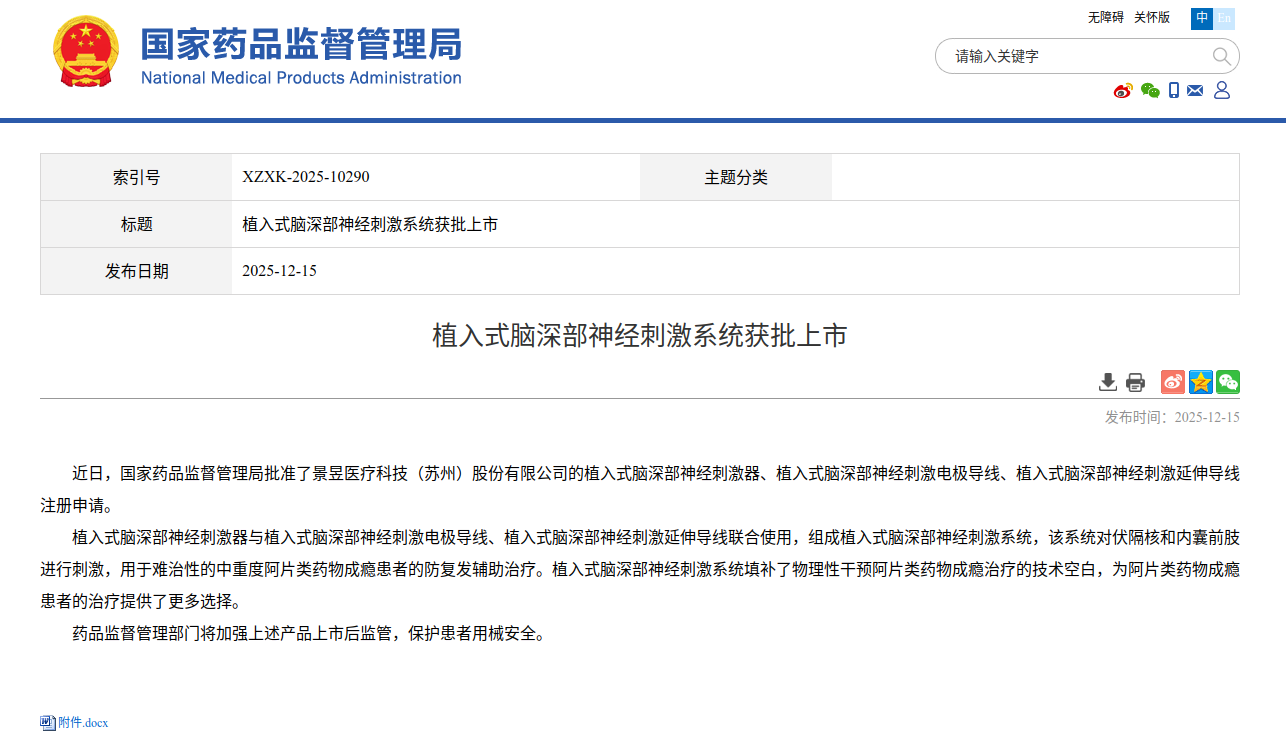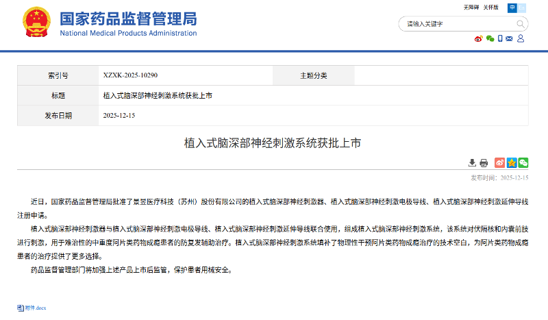近日,國家藥品監(jiān)督管理局(NMPA)正式批準(zhǔn)景昱醫(yī)療科技(蘇州)股份有限公司的植入式腦深部神經(jīng)刺激器、植入式腦深部神經(jīng)刺激電極導(dǎo)線、植入式腦深部神經(jīng)刺激延伸導(dǎo)線三類產(chǎn)品注冊(cè)申請(qǐng)。此次獲批的植入式腦深部神經(jīng)刺激系統(tǒng),作為全球首創(chuàng)侵入式腦機(jī)接口治療成癮類精神疾病產(chǎn)品,標(biāo)志著中國在腦機(jī)接口治療成癮類精神疾病領(lǐng)域的技術(shù)已躋身全球領(lǐng)先行列,為全球難治性藥物成癮治療帶來突破性解決方案。