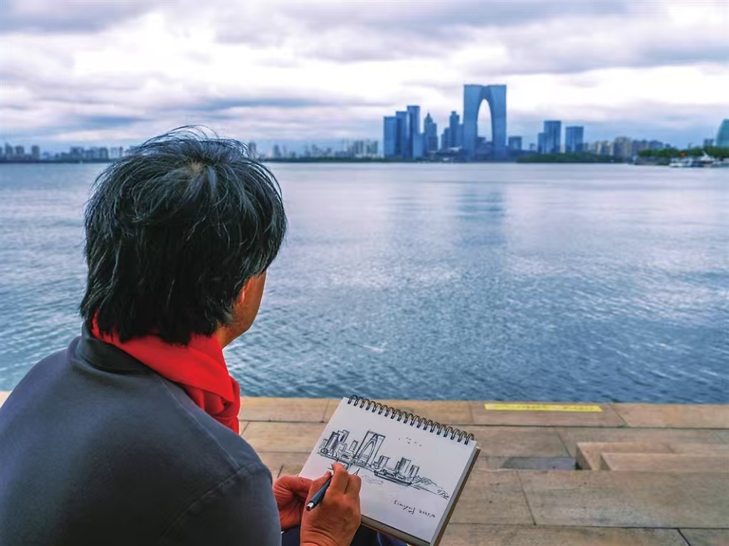 昨日,金雞湖邊,一位畫者的金雞湖速寫惟妙惟肖,城市美學(xué)躍然紙上。