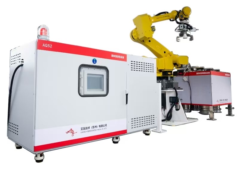 艾氫技術最新發布的“艾氫技術01號自動化鎂基模塊供氫系統”(簡稱AQNo.1),是國內首個模塊化鎂基固塊供氫系統。該系統以自動化、模塊化、兼容性為核心優勢,由儲氫瓶、儲氫模塊和供氫模塊三大核心構成,通過常溫常壓運輸儲氫瓶,完成氫氣從氫源地到用氫地的安全、高效儲運,為多元用氫場景提供高效靈活的解決方案,填補了國內模塊化固態供氫的技術空白,為加速我國氫能產業化進程提供了助力。