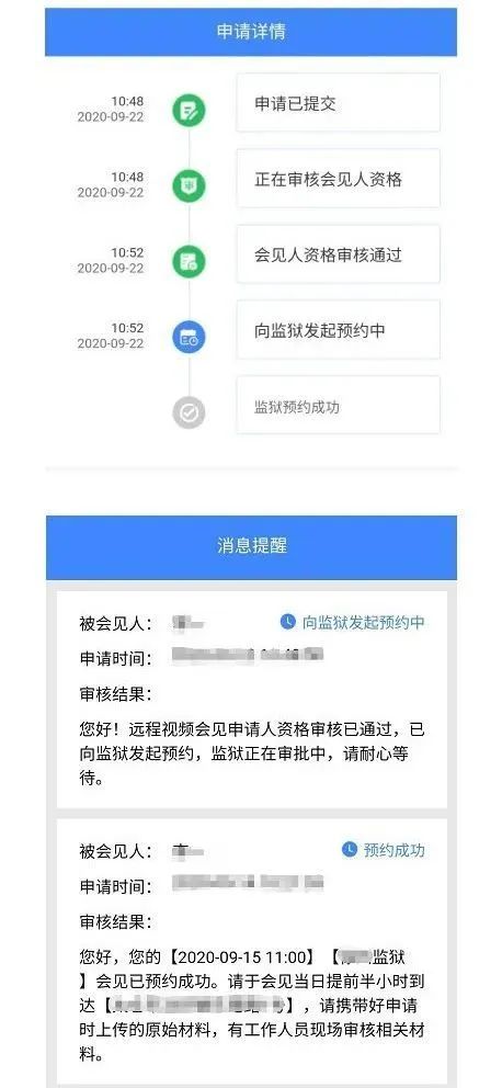 向監(jiān)獄預(yù)約成功后,工作人員會將會見時間、地點及相關(guān)要求通過“消息提醒”和手機短信發(fā)送給家屬,請注意查收。