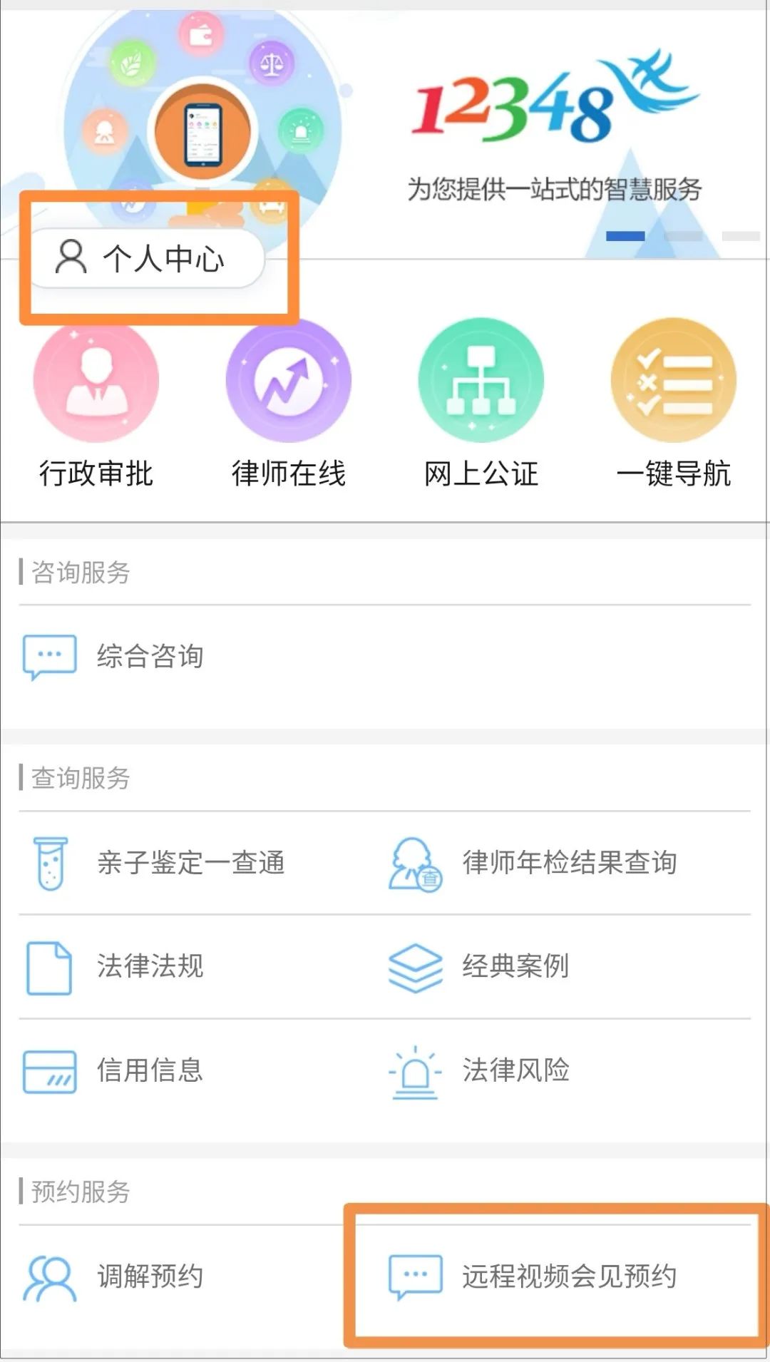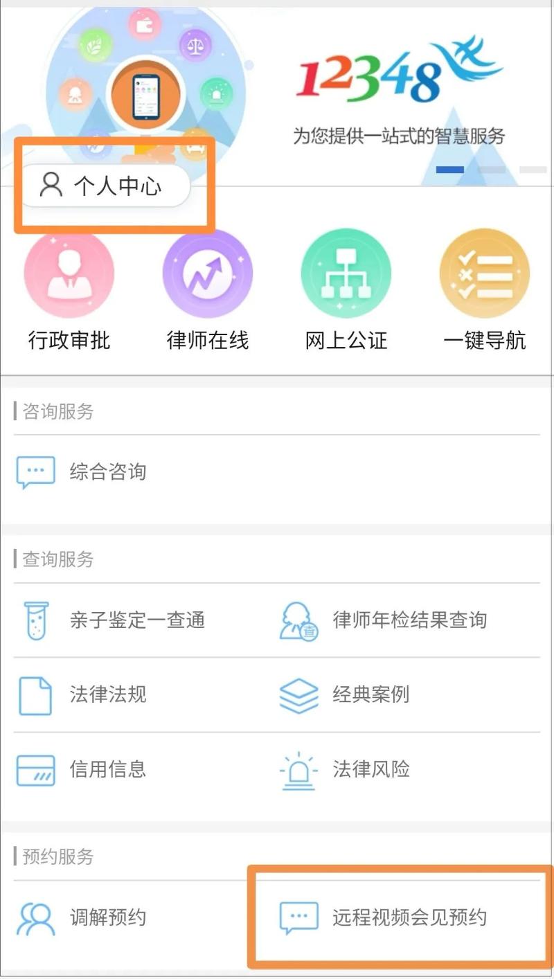第二步:進入公眾號后,點擊頁面底端“法律服務(wù)”,新用戶需要先點擊左上角的“個人中心”進行注冊。注冊后,在法律服務(wù)頁面“預(yù)約服務(wù)”板塊點擊“遠程視頻會見預(yù)約”。