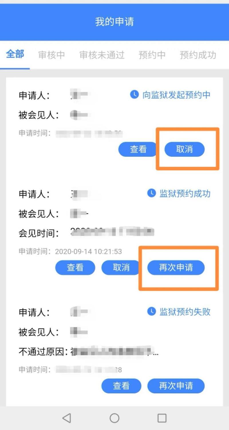 服刑人員家屬因故需要取消會見的,需在“我的申請”中進行“取消”會見操作、寫明原因,同時電話致電工作人員取消會見,以便工作人員及時與監(jiān)獄對接。向監(jiān)獄預(yù)約成功后,會見申請人無故取消會見的,半年內(nèi)不再安排遠程視頻會見。